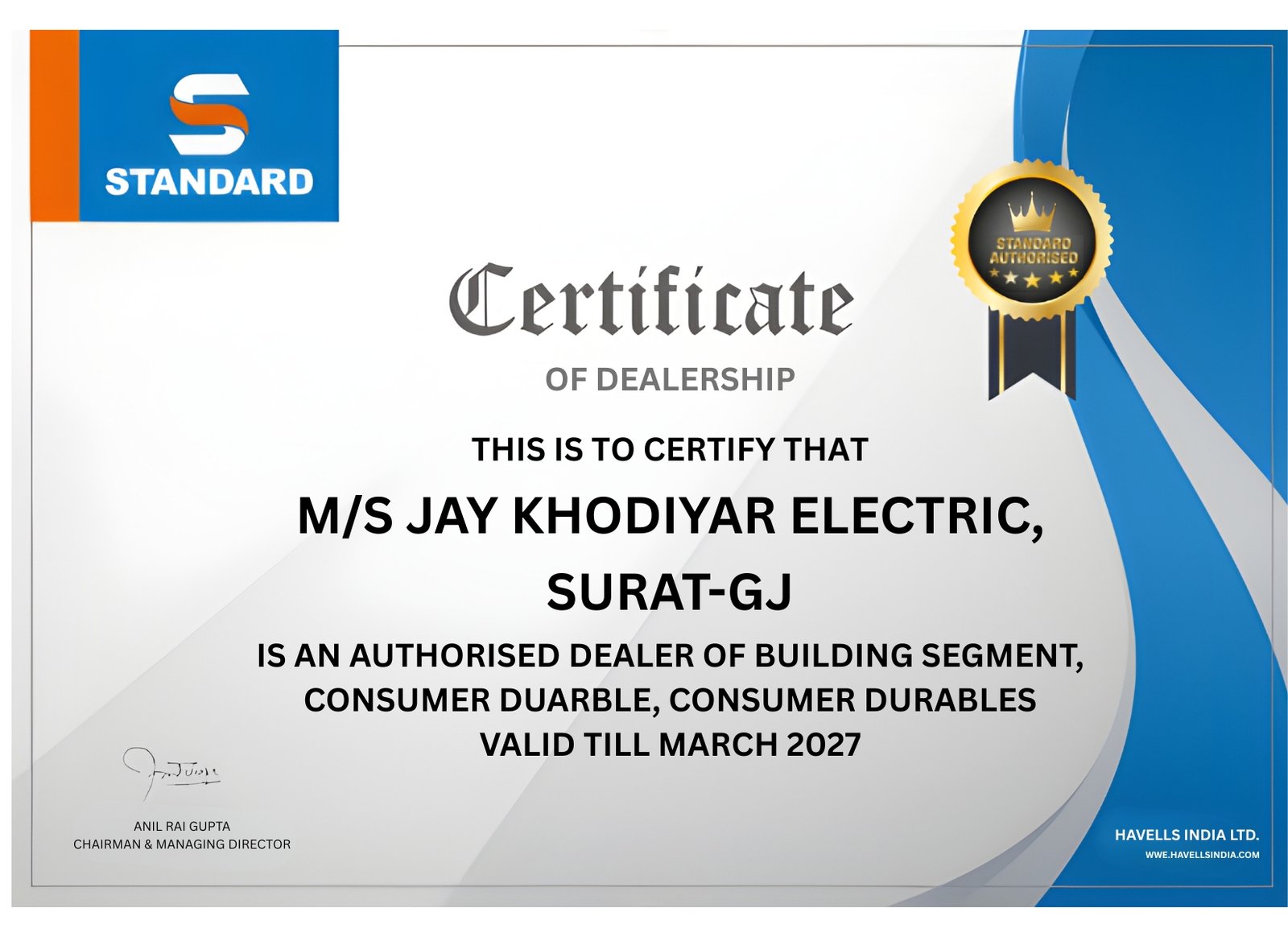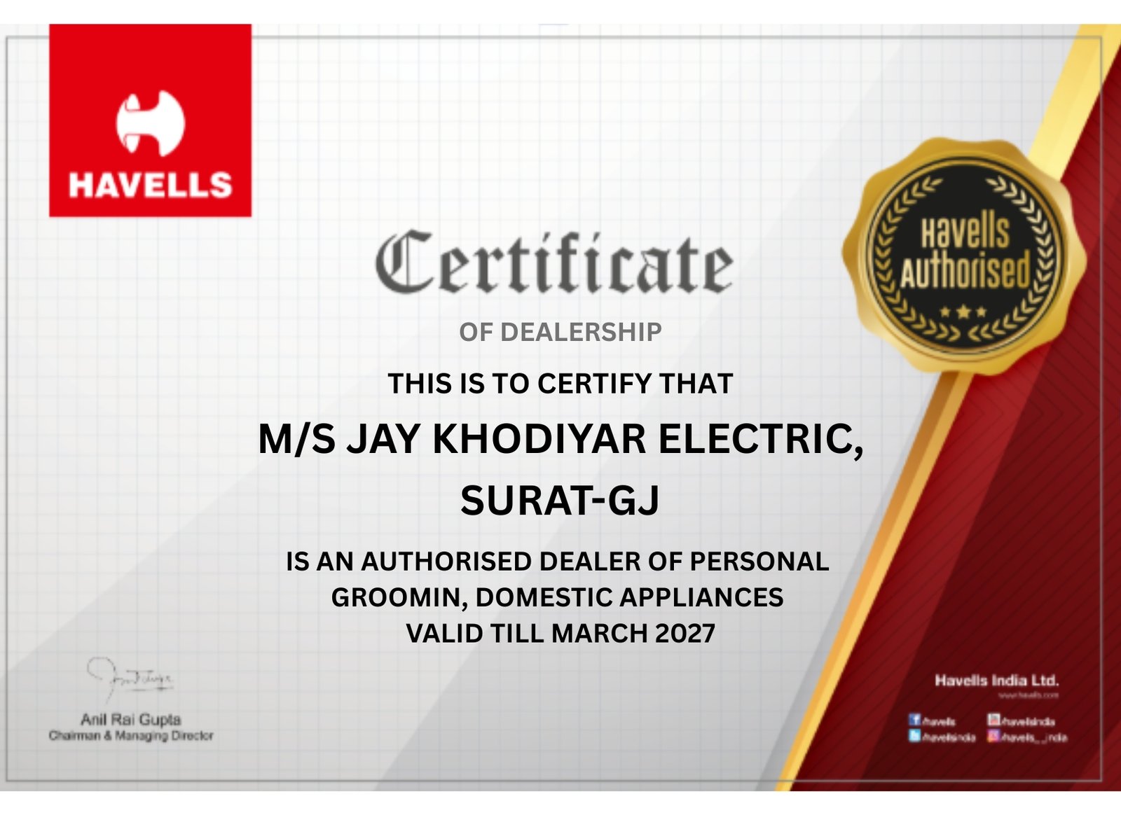 JAY KHODIYAR ELECTRIC IS A REGISTERED TRADEMARK BRAND PROVIDING HIGH QUALITY ELECTRICAL PRODUCTS, LIGHTING SOLUTIONS AND HOME APPLIANCES. OUR BRAND REPRESENTS TRUST, AUTHENTICITY AND CUSTOMER SATISFACTION WITH GENUINE PRODUCTS AND RELIABLE SERVICE.