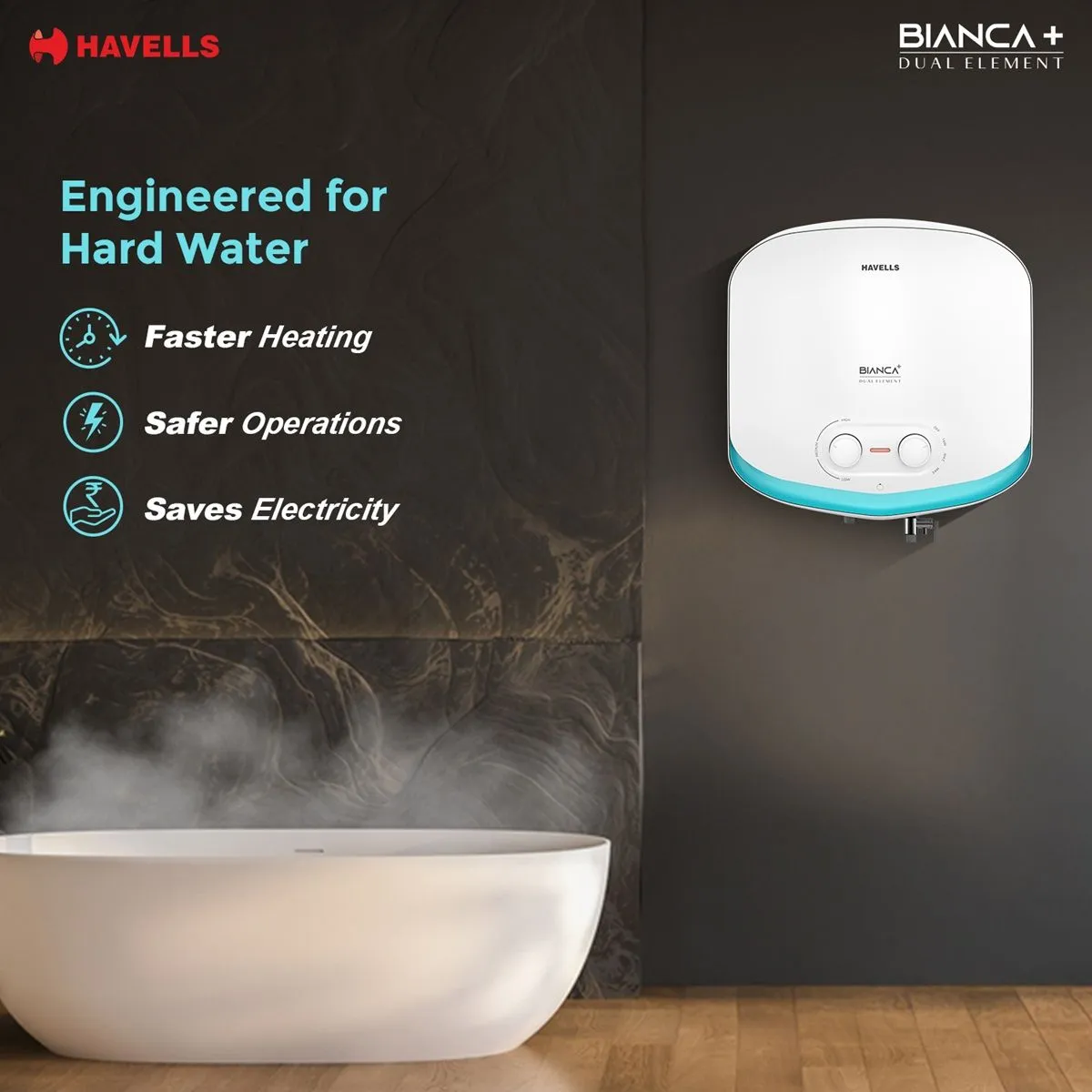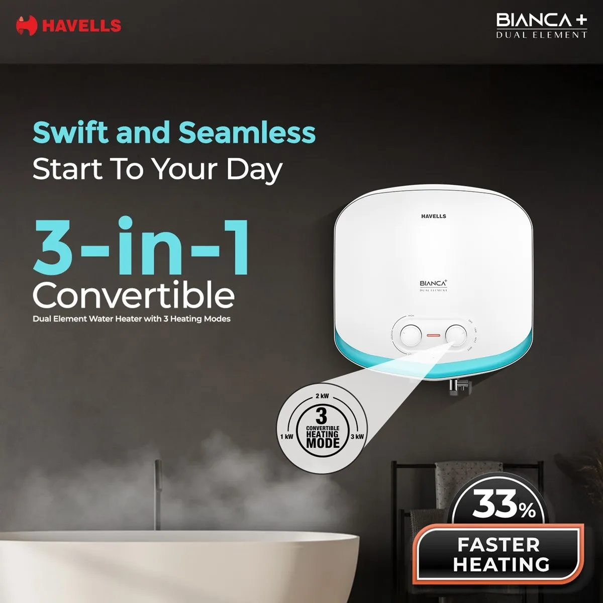 • 3-in-1 Convertible Dual Element Water Heater with 3 Heating modes: 33 % Faster Heating