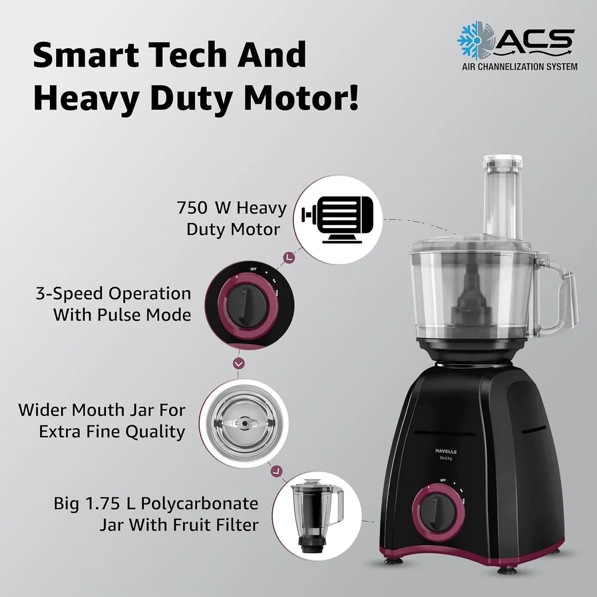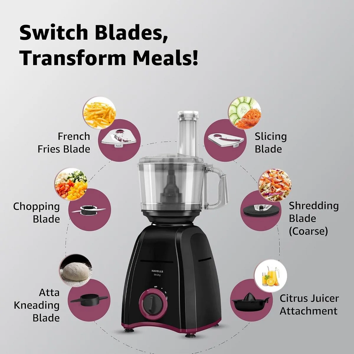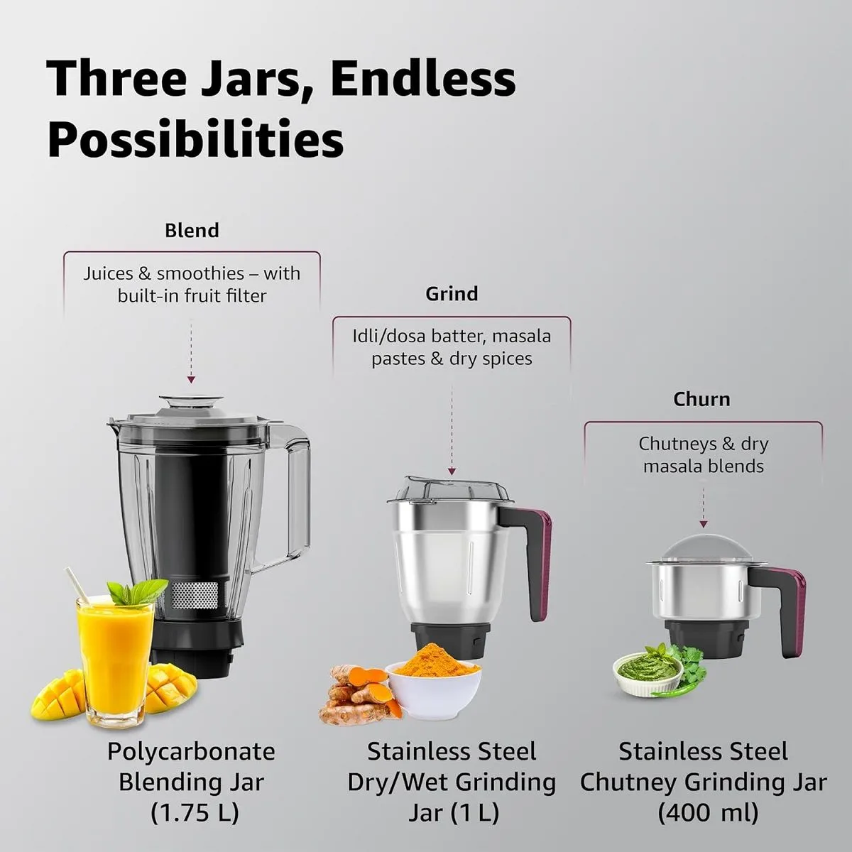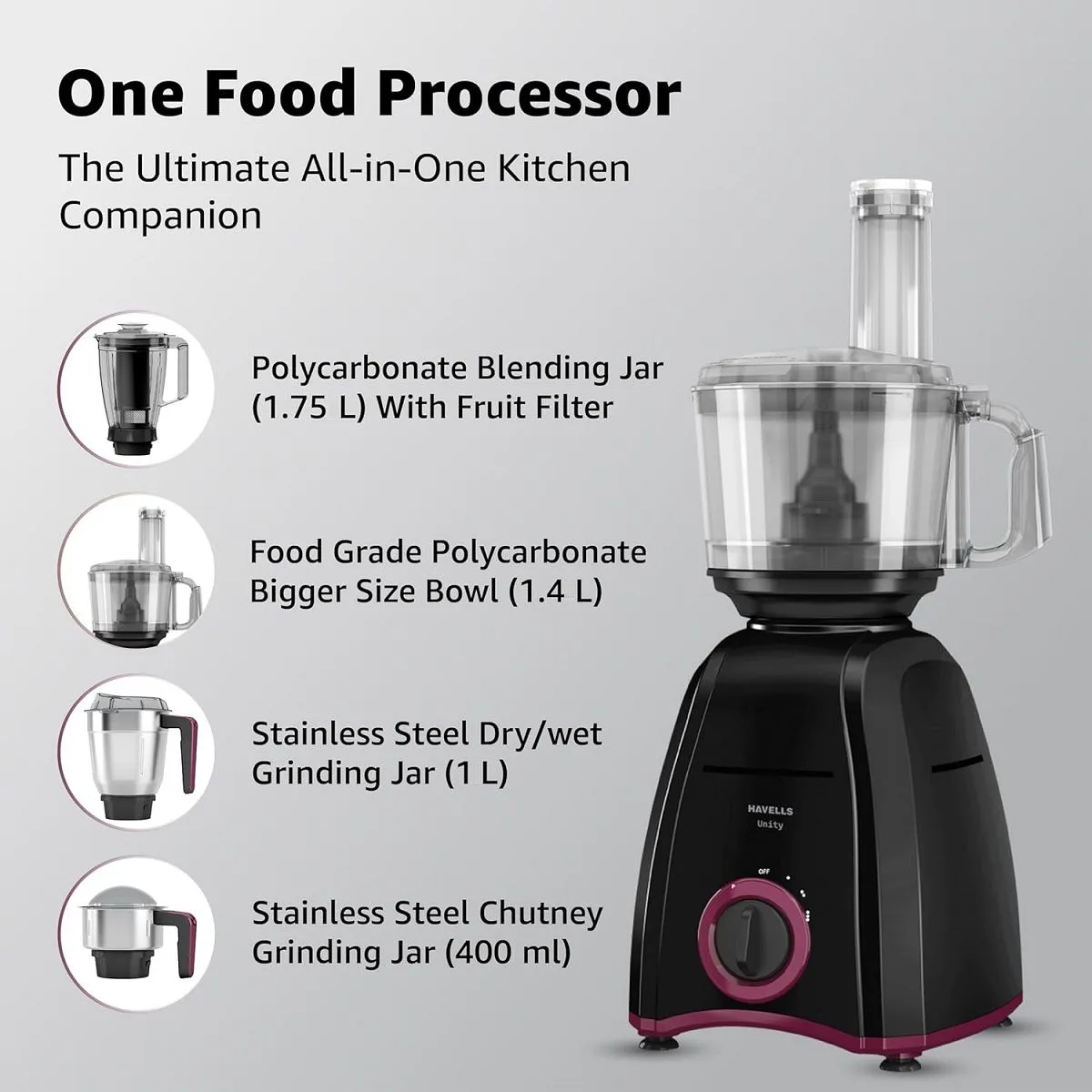 Net Contents1 N Motor Unit, 1 N Polycarbonate Blending Jar (1.75 L) with Lid & Fruit Filter & Food Pusher, 1 N Dry/Wet Grinding Jar (1 L) with Lid, 1 N Chutney Grinding Jar (400 ml), 1 N Food Processor Bowl (1.4 L), 1 N Citrus Cone Big, 1 N Citrus Cone Small, 1 N Gear Box, 1 N Blade Holder Disc, 1 N Shredding Blade, 1 N Choppimg Blade, 1 N French Fries Blade, 1 N Slicing Blade, 1 N Pusher Big, 1 N Pusher Small, 1 N Aata Kneading Blade, 2 N Chopping Blade Cover, 1 N Bowl Shaft